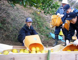 | こうやってみんなで収穫した文旦をいっぱい集めて、木枠につめます。 おいしい文旦になりますように・・・ |
