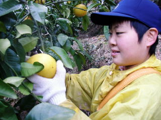 | おっきい文旦がおいしくできました。 新入生も初めての収穫にびっくり |