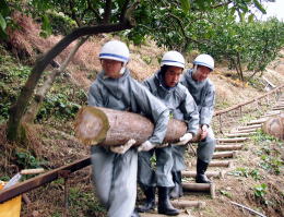| 文旦作業は収穫だけではありません。 少しでも日当たりが良くなるように伐採も します。 |