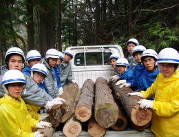 伐採した木は加工して木工作品にします。 険しい坂道を高3の先輩たちが下の道まで人力で運びます。 |