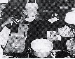 | 光の村開始当時の箱製造の様子 写真は仕上がった箱を手でくくっている 下 現在は機械でくくっている |